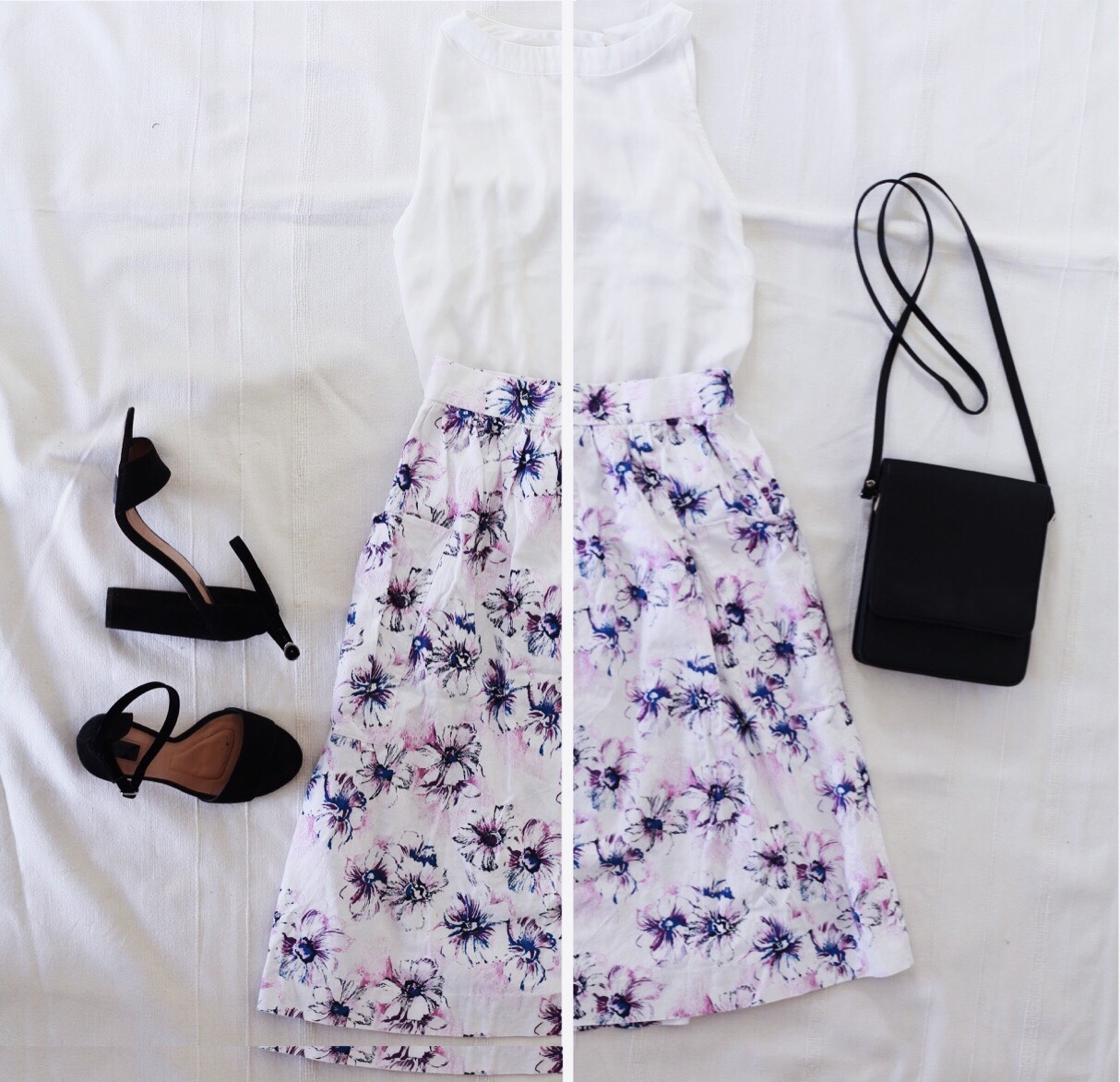 Ostatnia już propozycja na dziś to spódnica mojej Mamy! Przepiękne połączenie kolorów, do tego biała bluzka i czarne dodatki. Gdyby buty wymienić na nieco niższe myślę, że również świetnie sprawdzi się na inne okazje :)